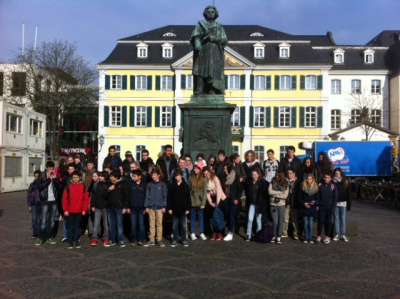 Bonjour, Mardi matin nos élèves nous ont raconté leur vie dans une famille allemande. Au programme de la journée Bonn, la ville de Beethoven. Promenade dans le centre-ville puis visite de la maison natale du compositeur. Après nous avons mangé notre pique-nique sous le soleil. Nous avons pris la direction de la Maison de l’Histoire qui retrace l’Histoire allemande de 1945 à aujourd’hui. Ce fut fort intéressant. Pour finir un peu de quartier libre à Bonn où beaucoup d’élèves profitent d’un passage au magasin HARIBO. Demain mercredi on passera la journée dans la nature avec la petite ville de Bad Münstereifel et Königswinter au bord Rhin. Tous les élèves vont très bien. A demain pour d’autres nouvelles.