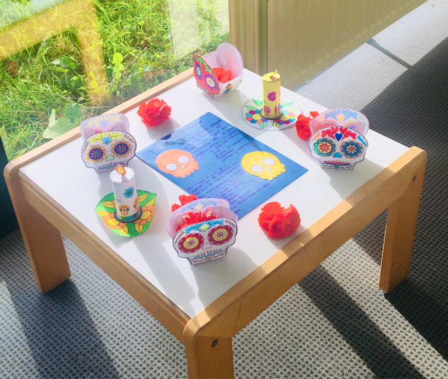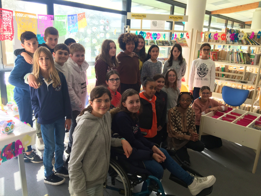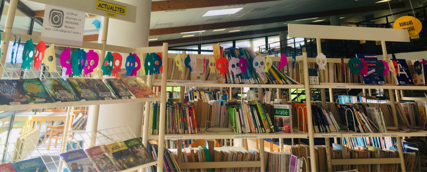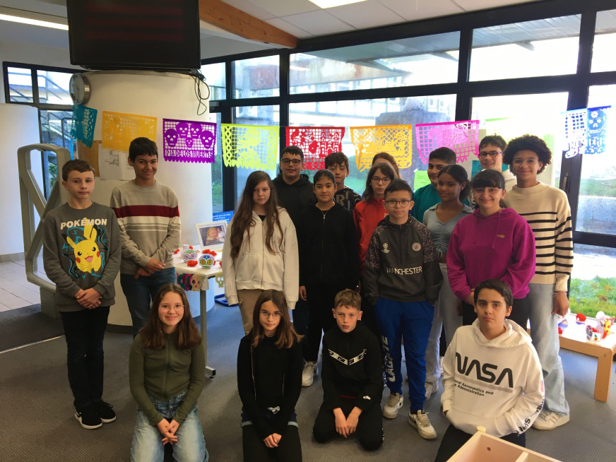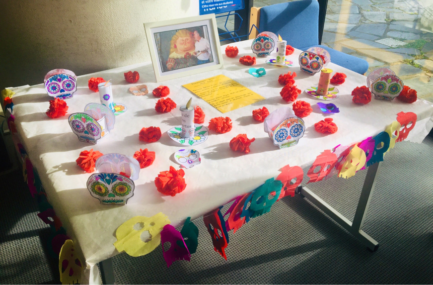 Les élèves de 5e du collège de l’Iroise ont travaillé sur un évènement culturel au Mexique : El día de los muertos. Après avoir étudié les dates et éléments clés en classe, ils se sont mis à l’ouvrage pour recréer une ambiance festive et colorée en créant différents éléments propres à cette fête. Tous ces éléments ont permis d’installer une exposition au CDI, accessible à tous.